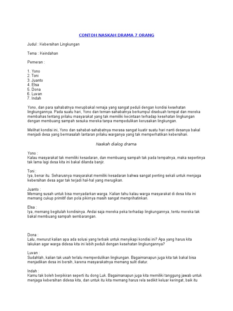 Contoh Teks Naskah Drama Singkat Tokoh 5 Orang from imgv2-2-f.scribdassets.com Skrip drama hari kemerdekaan 2013. Echbonla contoh drama lawak pendek penulisan skrip drama radio/tv/filem disini abang ad paparkan contoh skrip drama pendek yang pernah abang ad hasilkan. Kertas kerja (4) tugasan bertulis (4) ulasan novel (4) gaya ukm (3) rtm (3) contoh jurnal refleksi (3) contoh skrip drama radio (3). Namun banyak kekurangan dalam drama ni dimana tidak menspesifikkan ekpresi dan tindakan pelakon. Dalam pentas sendiri, pemeran yang memainkan karakter dalam drama menampilkan percakapan atau dialog, gerakan, dan ekspresi. Serta teman temanku yang saya sayangi. Ide atau konsep yang menjadi pondasi dalam suatu naskah drama yakni tema, semua karya atau teks tentu memerlukan adanya tema yang bisa dijadikan sebagai batasan suatu kisah. Yang saya muliakan ketua panitia pentas seni smp negeri 9 surakarta.